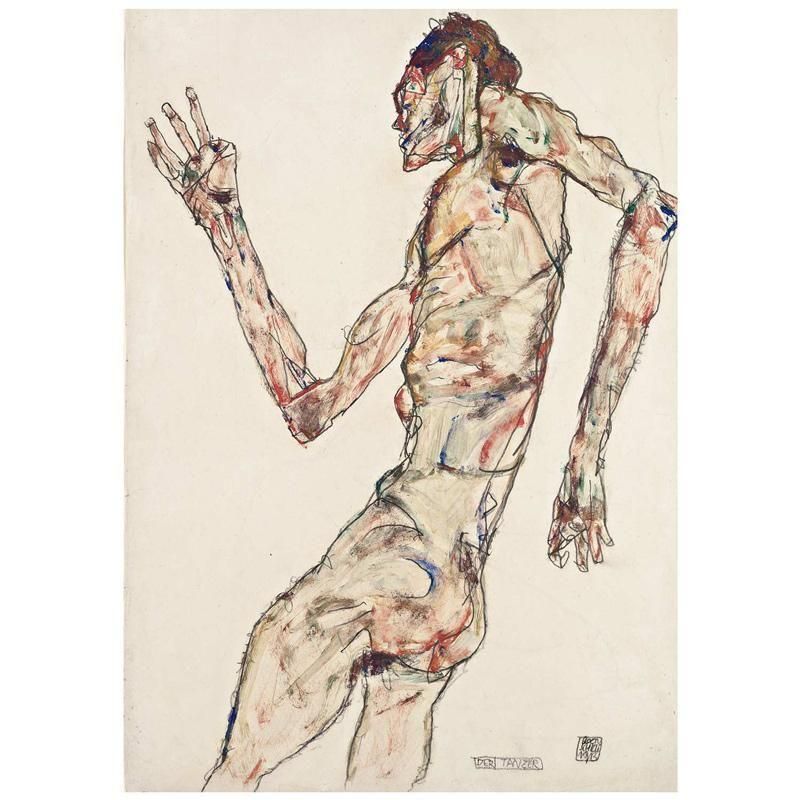 躍動感あふれるポーズをとる裸体の人物が描かれており、その身体は細長く、骨ばった印象を与えます。右腕は高く掲げられ、指は広げられ、左腕は力なく垂れ下がっています。身体には、赤や青といった鮮やかな色が部分的に使われ、筋肉や骨格の動きを強調するとともに、内面的な感情のうねりを表現しているようです。顔は横を向き、苦悩とも恍惚ともとれる複雑な表情を浮かべています。背景は描かれず、人物像が白い空間に浮かび上がることで、その存在感と表現が際立っています。この作品は、シーレが人間の身体を通して、その内面的なエネルギーや精神的な状態を深く探求しようとした、表現主義的なアプローチの典型であり、彼のデッサン力と感性の鋭さが凝縮された一枚と言えるでしょう。