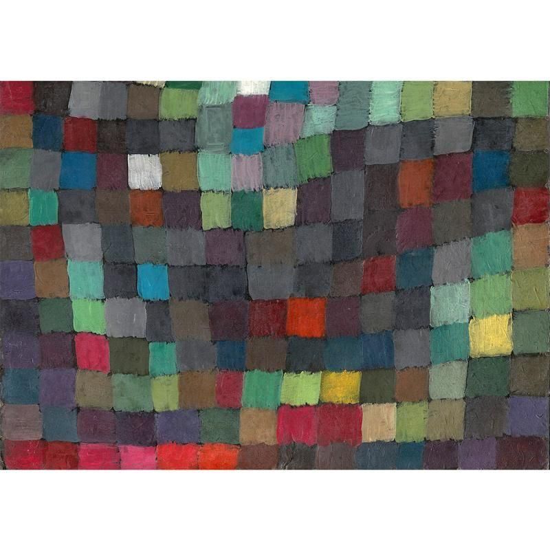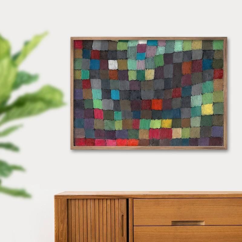生命力あふれる色彩と、リズミカルな構成が、見る者の心に喜びと希望を呼び起こします。画面全体に広がるのは、様々な形と色のブロックがパッチワークのように配置された、抽象的な風景です。一つ一つの色面は、まるで五月の陽光を浴びた花々や新緑、あるいは風に揺れる木々の葉のように、生き生きとした表情を見せています。特に目を引くのは、暖色系と寒色系が絶妙なバランスで配置されている点です。これにより、画面全体に奥行きと広がりが生まれ、単なる平面的な構成を超えた豊かな世界観を表現しています。クレーの筆致は、簡潔でありながらも、それぞれの色に深い感情と意味を込めているかのようです。この作品は、具体的な形を追うのではなく、色彩とリズムを通して、五月の持つ生命の躍動と、それに呼応する内なる感情を凝縮した、まさに魂を揺さぶる傑作です。