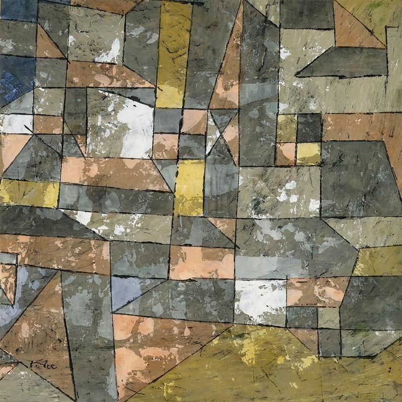 複雑な線と色面が織りなす構成は、見る者を北ドイツの風景へと誘いながらも、より深い精神的な領域へと引き込みます。画面全体に広がるのは、多角形の形をした色とりどりのブロックが、まるでパズルのように組み合わされた抽象的な風景です。グレー、茶、黄土色といった落ち着いた色合いの中に、時折現れる鮮やかな黄色や青がアクセントとなり、この地に宿る独特の光と影、そして風土を表現しているかのようです。特に目を引くのは、それぞれの色面を区切るように走る黒い線です。この線は、建物や地形の輪郭を暗示しながらも、同時に、見る者の思考を導くかのような、ある種の秩序を生み出しています。クレーの筆致は、簡潔でありながらも、それぞれの色に深い感情と意味を込めているかのようです。この作品は、単なる地理的な描写を超え、ある地域の持つ雰囲気や、そこに生きる人々の感情を凝縮した、まさに魂を揺さぶる傑作です。
