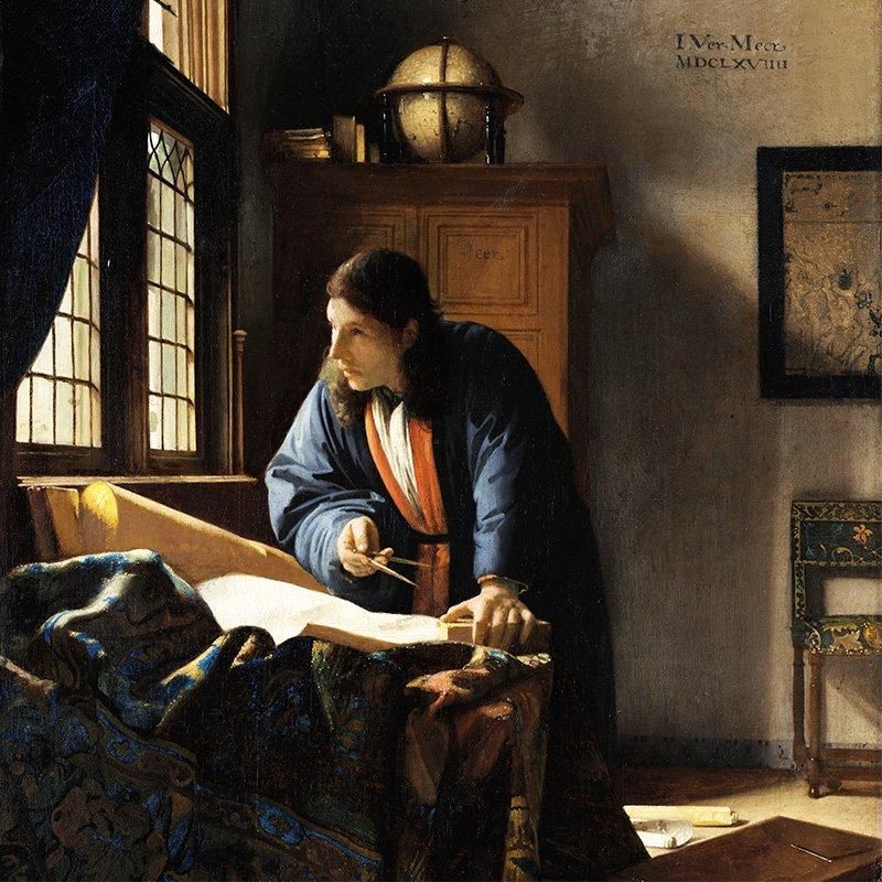 窓から差し込む光を浴びながら、コンパスを手に地図を広げる男性が描かれています。彼の視線は窓の外、あるいは遠くを見つめており、知的な探求心と好奇心に満ちた表情を浮かべています。部屋の中には地球儀や書物、巻物などが散乱しており、彼の職業と探求の深さを物語っています。窓から差し込む柔らかな光が、室内の細部までを照らし出し、地球儀や地図の質感、男性のローブのひだまでが丁寧に描かれています。フェルメール特有の光の表現が、知的な空間に静謐さと奥行きを与え、見る者にその場の空気感までも感じさせます。科学と知性の時代における探求者の姿を捉えたこの作品は、人間の知的好奇心と、世界への眼差しを象徴する一枚と言えるでしょう。