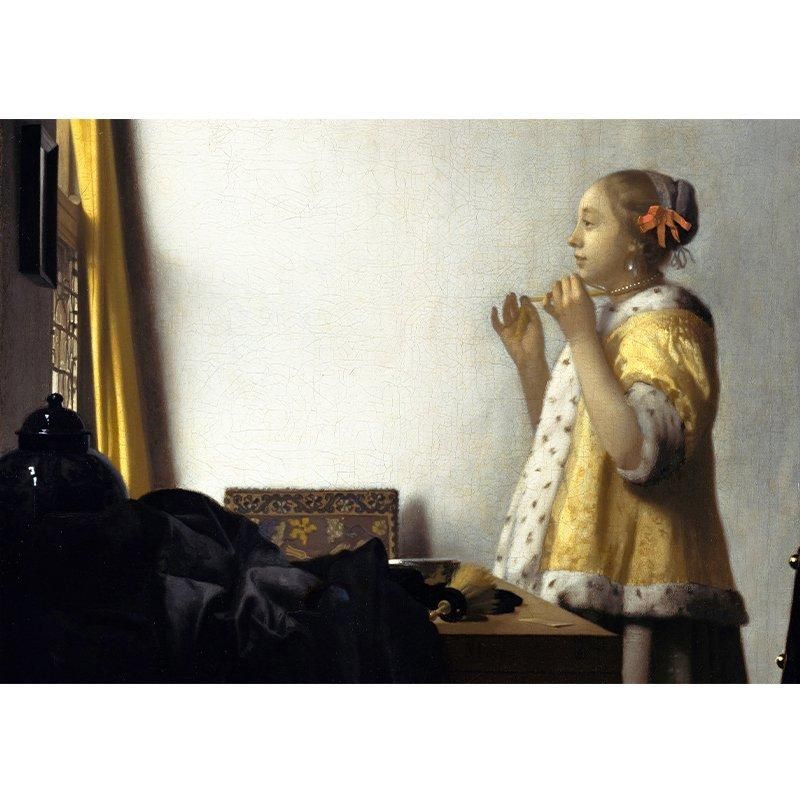 オランダ絵画を代表するバロック絵画の傑作であり、静謐な室内画として西洋美術史に名を刻む名画です。その神秘的な光の表現と、真珠の輝きが印象的な女性の姿は、インテリアにクラシックな美しさをもたらす油絵として、またアートコレクションとしても非常に価値のある芸術名品として、美術館でも高い評価を受けています。