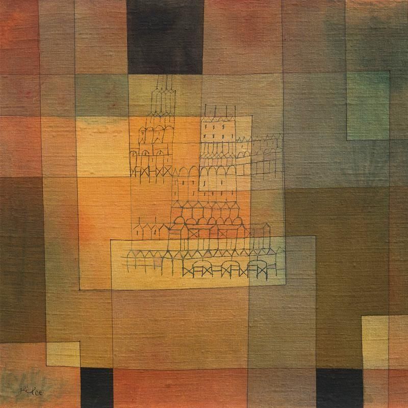 画面は温かみのある茶色やオレンジのグラデーションで構成され、そこに線描で繊細に描かれた建築的な構造が浮かび上がります。この構造は中世の大聖堂や都市のスカイラインを思わせるもので、クレーが音楽的なリズムと建築的な秩序を融合させたことが伺えます。