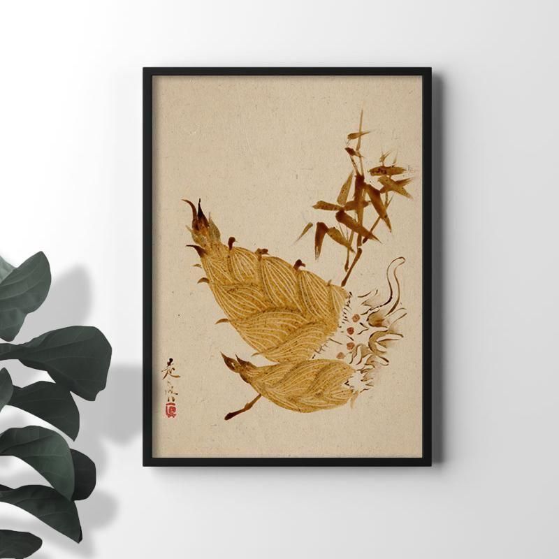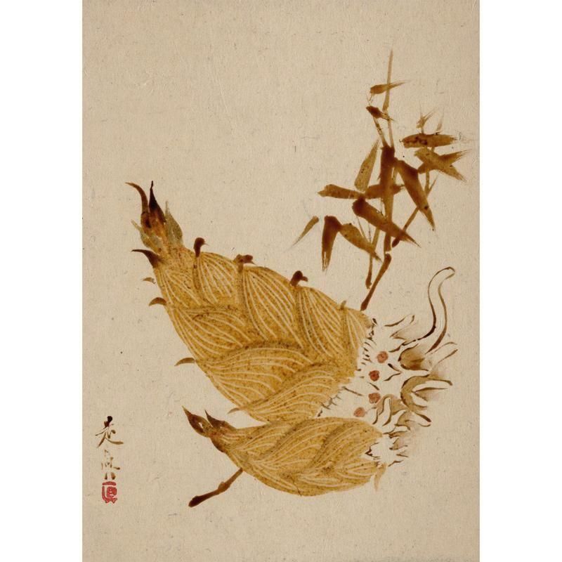力強く、そして繊細に描かれた筆致は、大地から顔を出し、力強く成長しようとする生命のエネルギーを今にも感じさせます。その柔らかな筍の皮と、すでに天に向かって伸び始めた小さな竹の葉。それらは、静けさの中に秘められた、尽きることのない生命力を物語っています。この作品は、単なる植物画ではなく、日本の伝統的な美意識と、自然への深い畏敬の念が融合した、心に深く響く芸術です。この絵を前にすると、私たちは、自然の持つ力強さと、生命の輝きを改めて感じることができるでしょう。それは、私たちの日常に、静かで豊かな感動をもたらしてくれます。