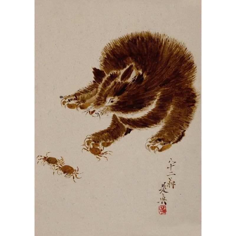 ユーモラスで愛らしい「熊」と、その前にちょこんと座る二匹の「蟹」です。ふわふわとした毛並みは、筆致の勢いと墨のにじみで見事に表現され、見る人の心を和ませます。大きな熊の目線は、まるで小さな蟹たちを遊び相手に誘っているかのよう。その愛らしい表情と、コミカルな構図は、思わず笑みがこぼれてしまうような、温かい雰囲気を生み出しています。この作品は、柴田是真が、自然の生き物を深い愛情とユーモアをもって見つめていたことを物語っています。それは、単なる写生画ではなく、生きとし生けるものへの優しい眼差しと、生命の輝きを今に伝える、心温まる芸術です。