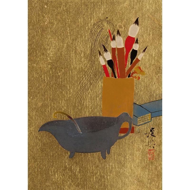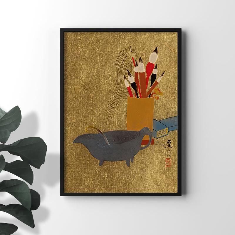 この絵に足を踏み入れると、そこは画家が魂を込めて創作に励む、静謐な空間です。金色の背景は、まるで彼の才能が放つ光か、あるいは芸術の神聖さを表現しているかのようです。その中に描かれたのは、日常の道具である水入れと、画家の魂そのものである絵筆。乱雑に見える筆は、創造の情熱と、尽きることのない探求心を物語っています。この作品は、単なる静物画ではありません。それは、芸術家が日々の暮らしの中で、いかに真摯に美と向き合っていたかを物語る、詩的な記録なのです。この絵を前にすると、私たちは、日々の生活の中に潜む美しさや、創作への情熱を改めて感じることができるでしょう。