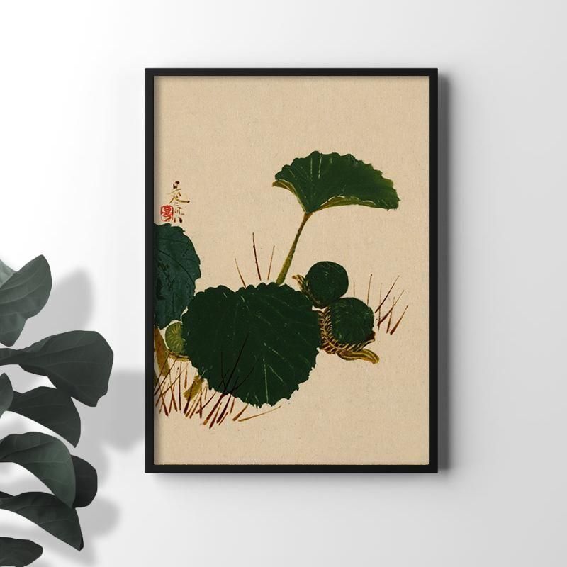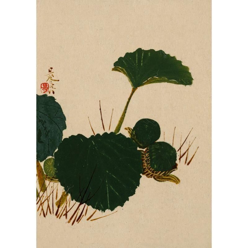晩秋から冬にかけて花を咲かせるツワブキの葉とつぼみです。力強く、そして繊細に描かれた葉は、まるで生命の神秘を凝縮したかのようです。その柔らかな筆致と、鮮やかな色彩が、静けさの中に秘められた、尽きることのない生命力を物語っています。この作品は、単なる植物画ではなく、日本の伝統的な美意識と、自然への深い畏敬の念が融合した、心に深く響く芸術です。この絵を前にすると、私たちは、日常の喧騒から離れ、穏やかで静かな安らぎの世界へと誘われるでしょう。