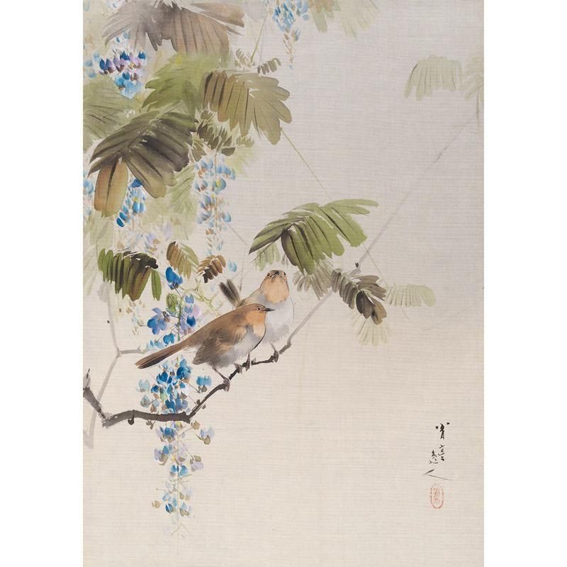 恋人たちが寄り添うかのように、二羽の小鳥が向かい合う、愛らしい瞬間を捉えています。柔らかな色彩で描かれた藤の花と、しなやかな枝が、二羽を優しく包み込むように描かれており、自然界に存在する温かさと穏やかさを感じさせます。鳥たちの表情や仕草は、静かな愛情や、お互いを思いやる気持ちを伝えているかのようです。