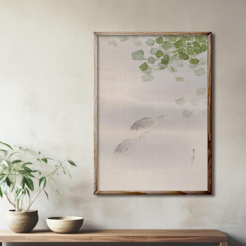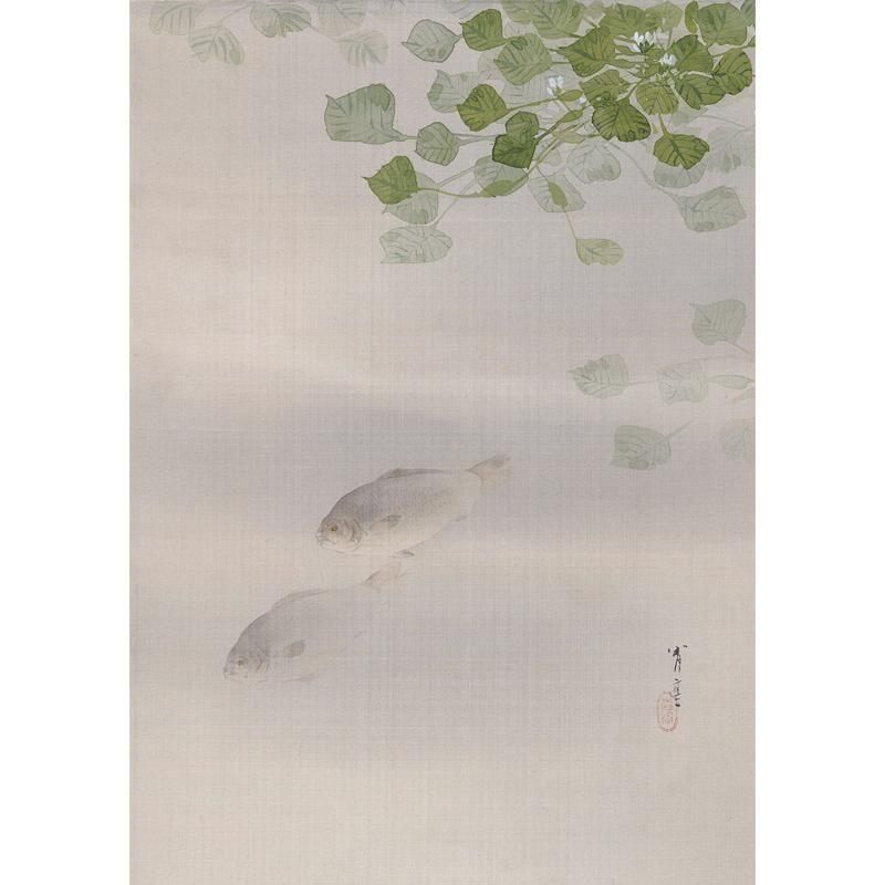 日本画 渡辺省亭 鮒図 水辺の風景 花鳥画 明治時代 アート 絵画 骨董品 コレクション インテリア 和室 和モダン 美術品 美しい 繊細 芸術 静寂 自然 魚類 水墨画 伝統文化