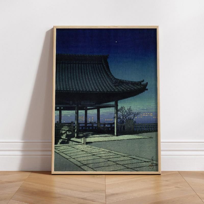 川瀬巴水 新版画 木版画 浮世絵 旅みやげ 大阪高津 夜景 寺院 都会 風景画 日本の美 アート インテリア 和モダン 美術鑑賞 版画コレクション 額装 芸術家 伝統文化 紺碧 静寂 光と影 ロマンティシズム 建築美 都市景観 ジャポニズム コントラスト