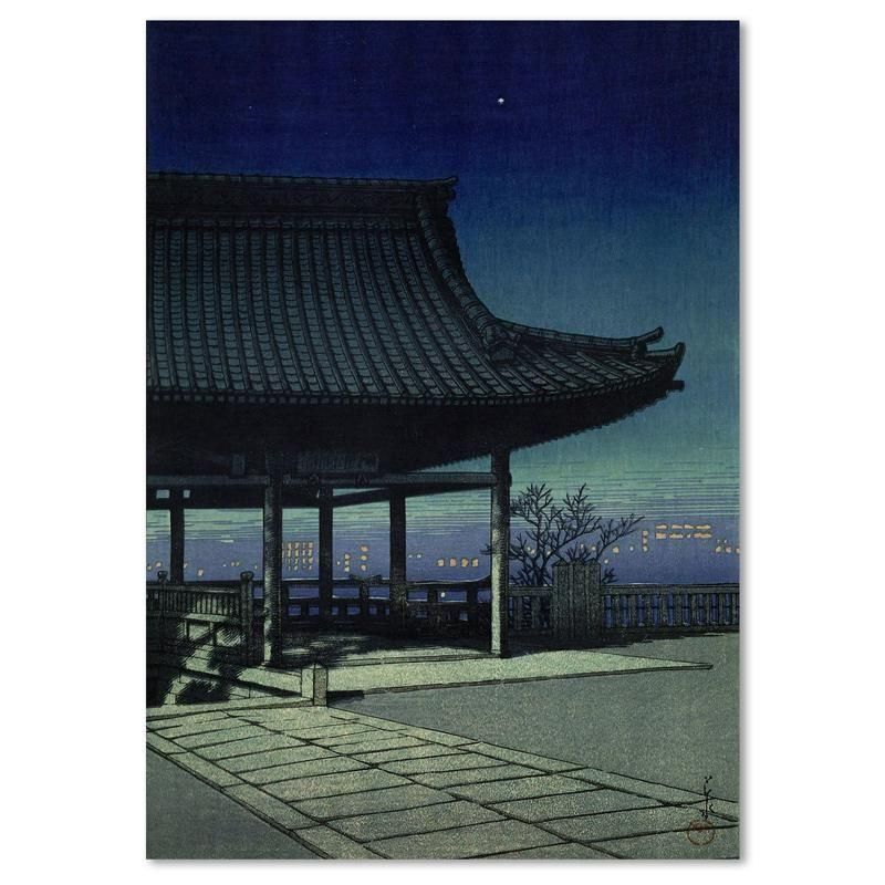 巴水は、歴史ある高津のお堂の建築美を力強く描き出す一方で、眼下に広がる街の灯りには温かいノスタルジーを込めています。