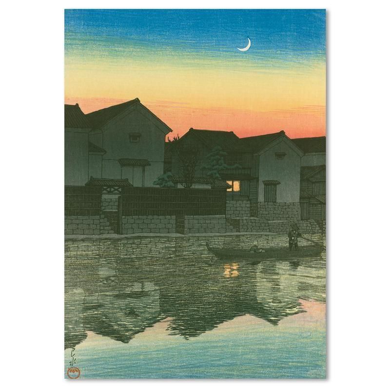 川瀬巴水 新版画 木版画 浮世絵 旅みやげ 出雲松江 三日月 夕景 掘割 運河 建物 風景画 日本の美 アート インテリア 和モダン 美術鑑賞 版画コレクション 額装 芸術家 伝統文化 郷愁 詩情 茜色 群青色 空間演出 ジャポニズム コントラスト