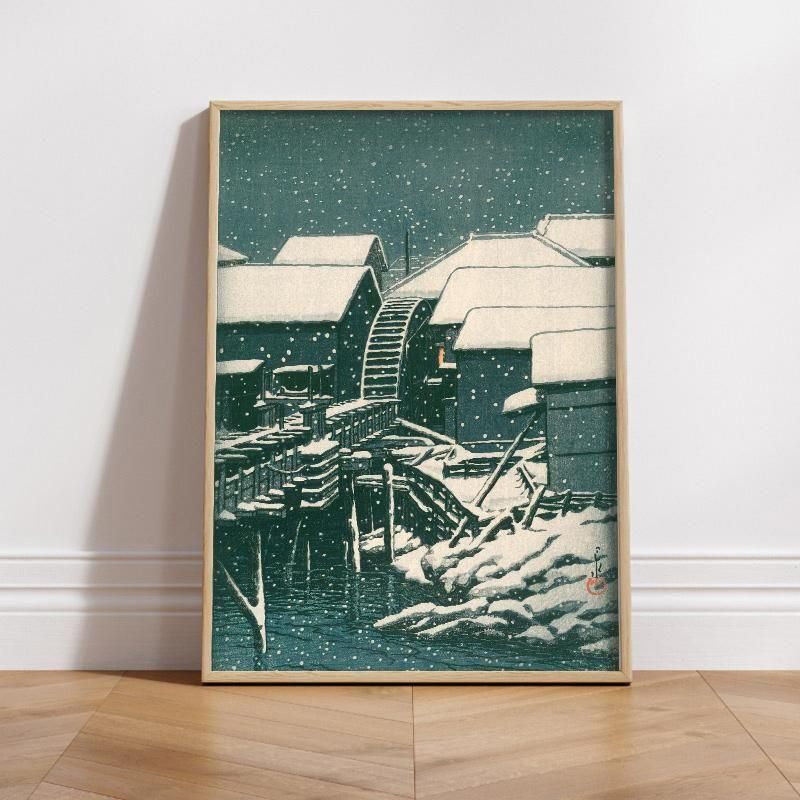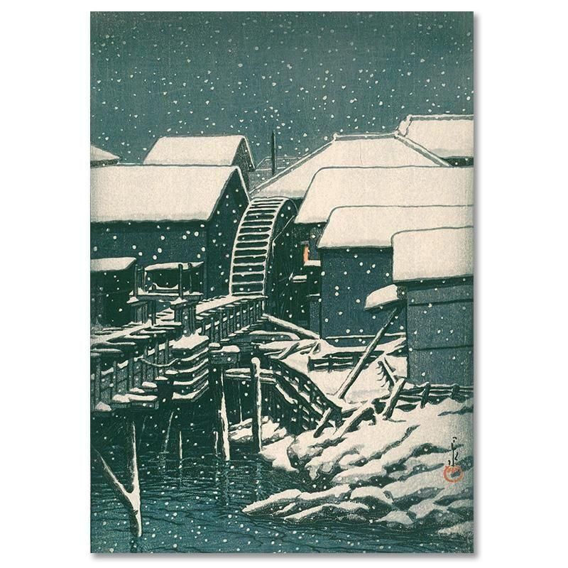 川瀬巴水 新版画 木版画 浮世絵 関口の雪 水車小屋 雪景色 冬 風景画 日本の美 アート インテリア 和モダン 美術鑑賞 版画コレクション 芸術家 伝統文化 静寂 叙情 郷愁 都会の雪 水車 空間デザイン 青と白 情感 ノスタルジー