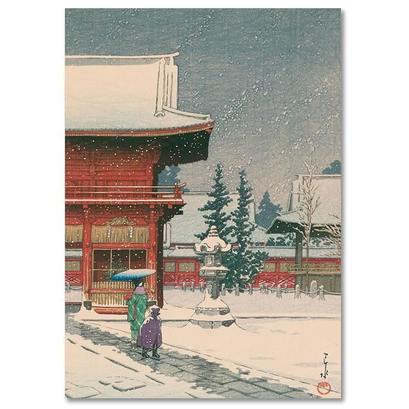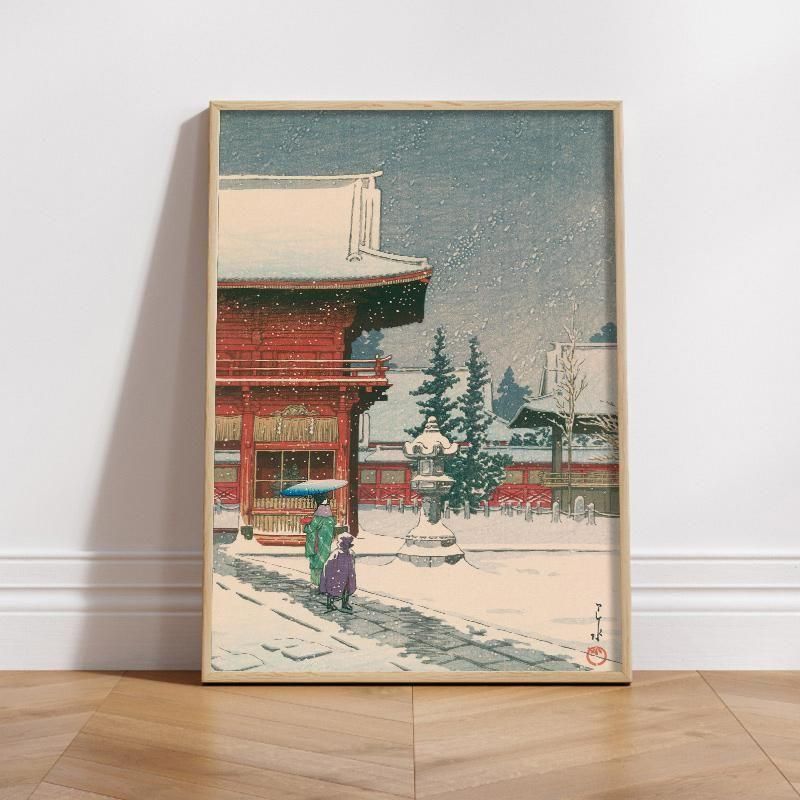 川瀬巴水 新版画 木版画 浮世絵 根津権現の雪 根津神社 朱塗り 雪景色 冬 寺社 風景画 日本の美 アート インテリア 和モダン 美術鑑賞 版画コレクション 芸術家 伝統文化 静寂 叙情 都会の雪 空間演出 朱色 傘 和装