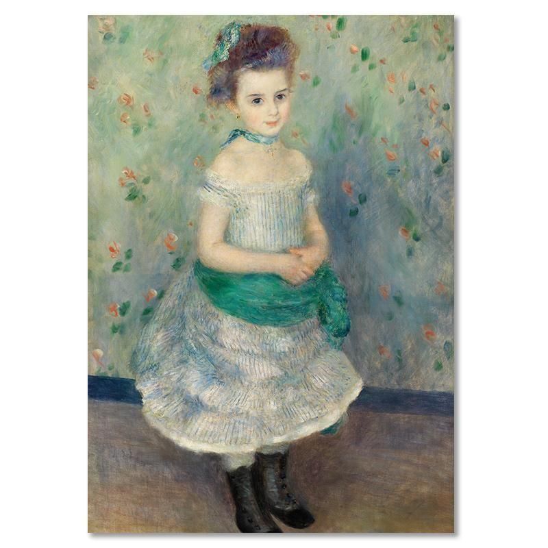 ルノワールと印象派の偉大な理解者であった画商、ポール・デュラン=リュエルの娘ジャンヌの、無垢な輝きを永遠に封じ込めた傑作です。あどけない少女は、どこか内気で上品な雰囲気を漂わせながら、見る者へまっすぐな視線を投げかけています。薄いブルーの縦縞のドレスと、ウエストを締めくくる鮮やかなエメラルドグリーンのサッシュ(飾り帯)が、少女の繊細な存在感を際立たせています。特に、背景の淡い花柄の壁紙は、印象派の軽快な筆致で描かれ、まるで甘い夢の空間にいるかのような幸福感と柔らかな光を室内に満たしています。この一枚は、ルノワールが人生の喜び、そして愛すべき子供の姿を、惜しみない色彩の魔法で祝福した、甘美で心に響く肖像画です。