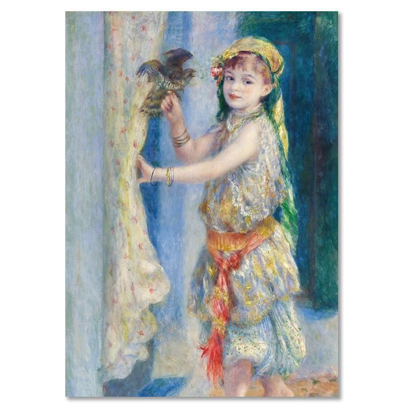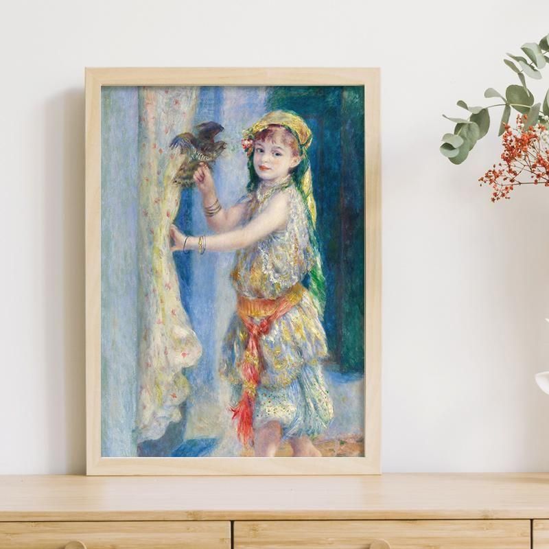 ルノワールが1882年に描いた鳥と少女(アルジェリア 衣装)は、印象派の枠を超えた名画です。フルーリーという子どもの肖像画は、ターバンや刺繍が施された朱色の飾り帯など、オリエンタルな衣装を纏い、光のコントラストが際立ちます。このフランスの油絵は、美術品のアートとしてインテリアの装飾に優れ、壁面を彩る絵画の複製画は、異国情緒を添えます。