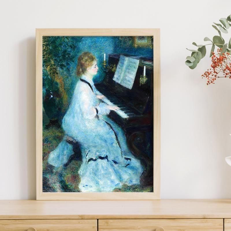 ルノワールが1875年に制作したピアノを弾く女性は、印象派の名画として、シカゴに所蔵されています。白いドレスと鍵盤、キャンドルの光が青い背景に浮かび上がる油絵の肖像画は、音楽を奏でる室内の優雅な雰囲気を表現しています。フランスのこの絵画の複製画は、曲線を多用した装飾的な美術品としてインテリアのアートになり、静かな光の中で優雅な暮らしを演出してくれます。