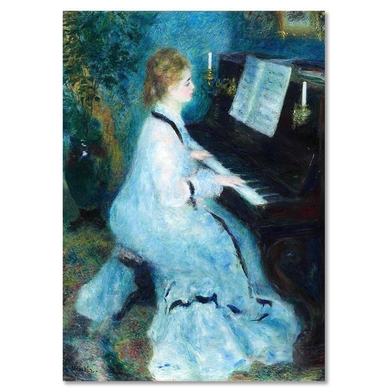 ルノワール ピアノを弾く女性 印象派 名画 アート インテリア 油絵 フランス 絵画 複製画 肖像画 1875年 音楽 白いドレス 青 背景 キャンドル 光 室内 曲線 優雅 装飾 美術品 シカゴ 鍵盤