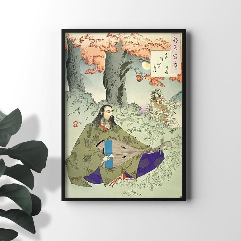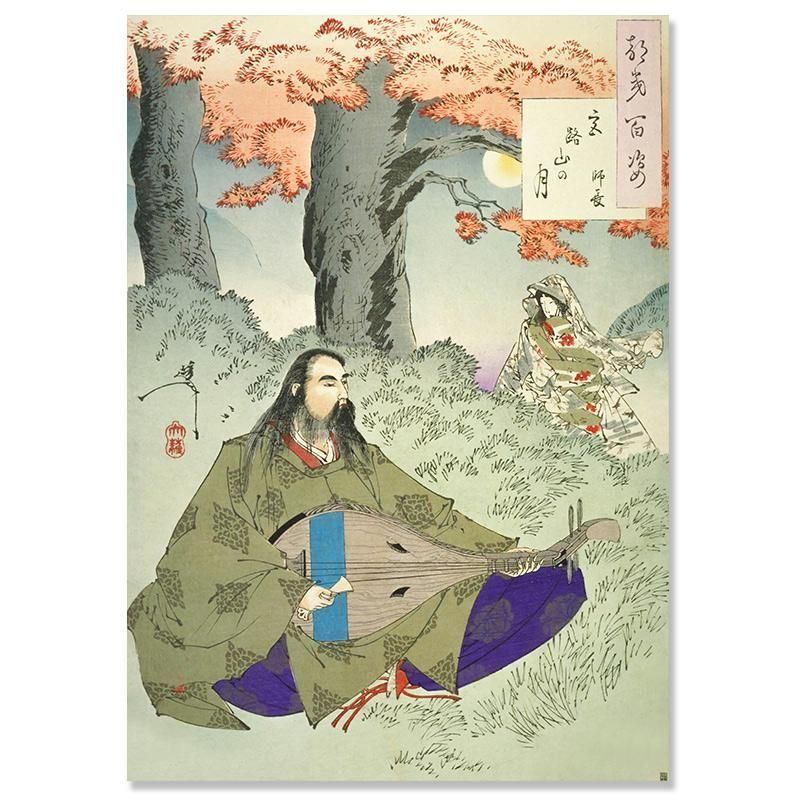 月岡芳年の浮世絵「宮路山の月 師長」は、百人一首を題材に、遠流となった琵琶の英雄の悲劇を描いた時代物の武者絵です。師長の演奏する琵琶の音が月光の下、宮路山に響く場面は、和歌の世界を劇的な構図と鮮やかな色彩で表現しています。この人物画は月を象徴的に使用し、木版画の表現技法で師長の孤高の伝説を描き出した伝統芸術として、日本美術や浮世絵販売において芸術的価値を高めています。
