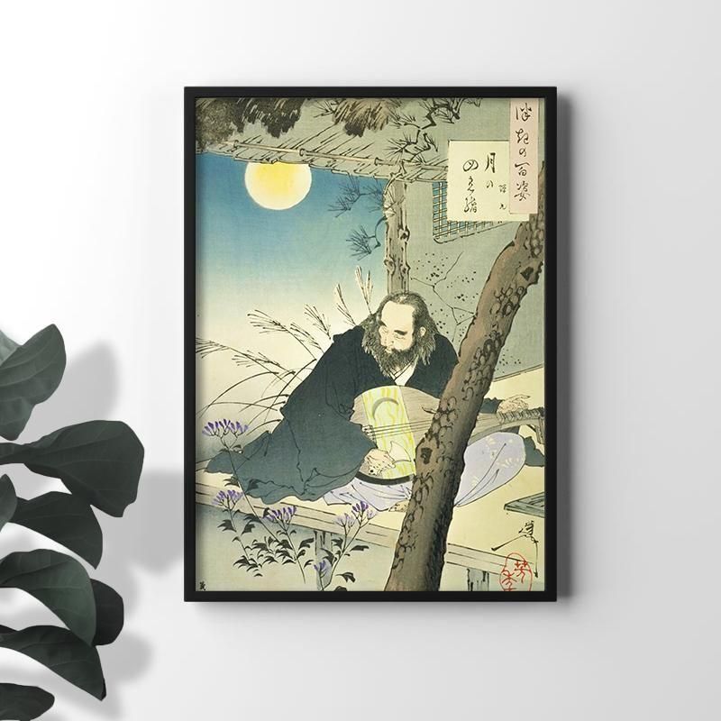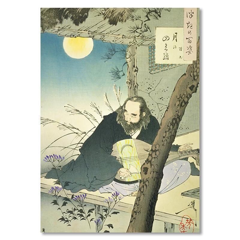 月岡芳年の月百姿シリーズの一つである月の四の緒 蝉丸は、浮世絵の錦絵として、日本古典の古今和歌集に登場する伝説の盲目の楽人をドラマティックに描いています。満月の月光の下、蝉丸が松の木の下で琵琶を奏でる孤高の姿は、宿命と芸術、そして無常観が混ざり合った情念を音楽として魂の独白に変える感動的な人物画です。秋の七草が添えられた静かな情景は、哀愁を帯びた蝉丸の精神性を強調し、和の心に訴えかける日本美術の傑作となっています。