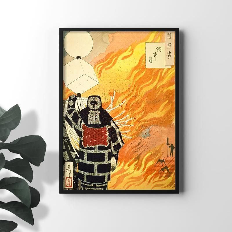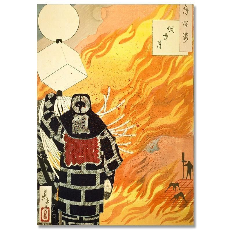 月岡芳年の月百姿 烟中月は、浮世絵の錦絵として、炎と猛煙が立ち込める火災現場で枡の纏を持つ火消しの英雄をドラマティックに描いた時代絵です。この作品は、孤高の使命感に燃える纏持ちの緊迫感と命を懸けた男の自己犠牲の精神を、満月の静かな光と熱狂と静寂の構図によって視覚詩に昇華させています。江戸の華と謳われた粋の美学を体現する火消の姿は、明治時代の日本美術における月岡芳年の卓越した表現を示しています。
