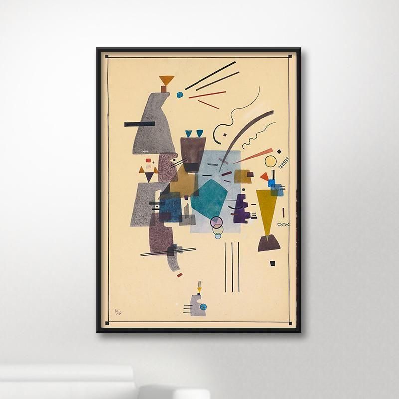バウハウス時代に探求された幾何学的な厳密さと、色彩の持つ精神的な温もりが劇的に融合した作品です 。「クール」な青や灰色の幾何学的な形が、「温められた」黄色や赤の光、斜めの線と対比し、静的な構造の中に動的なエネルギーと感情の機微を生み出しています。半透明の色彩と重なり合う形態は、まるで内面の思考や感情が、論理という枠を超えて溢れ出す瞬間を捉えたかのような神秘的な美しさを湛えています。