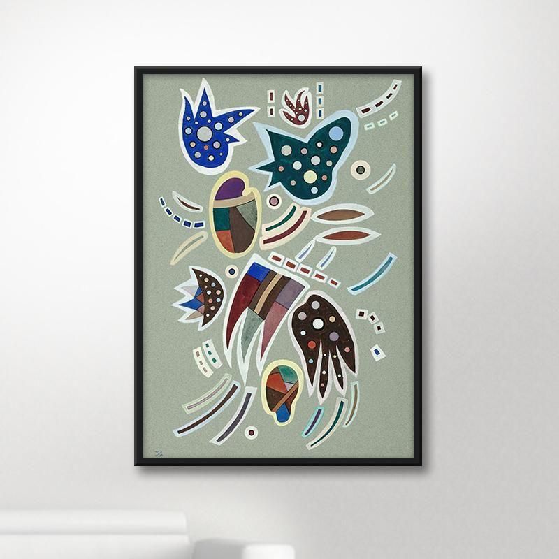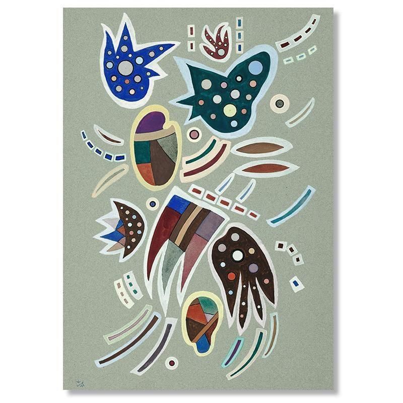 埋め尽くす青、赤、茶などの多様な色彩で彩られた細胞のような有機的形態は、根源的な生命力の爆発を表現しています。水玉模様や鋭い爪のような形は、ユーモラスさと不気味さを併せ持ち、見る者の想像力をかき立てます。これらのエレメントは、規則性を崩しながらも画面全体で絶妙なバランスを保ち、抽象的な調和を生み出し、カンディンスキー晩年の深遠な探求を示しています。