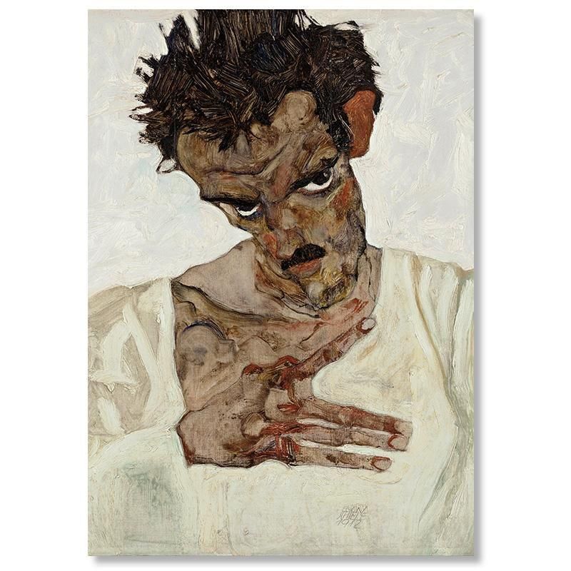 1912年に描かれたこの自画像は、エゴン・シーレの芸術家としての魂の生々しい告白であり、ドラマティックな自己表現の極致を示しています。うつむいた頭と歪んだ表情は、自己の内面に深く沈み込み、不安や苦悩といった激しい感情を隠すことなく暴き出しています。衣服の白さと、顔や手の土色の病的な色調の対比が、見る者に強烈な緊張感と衝撃を与え、人間存在の根源的な孤独を深く感じさせます。