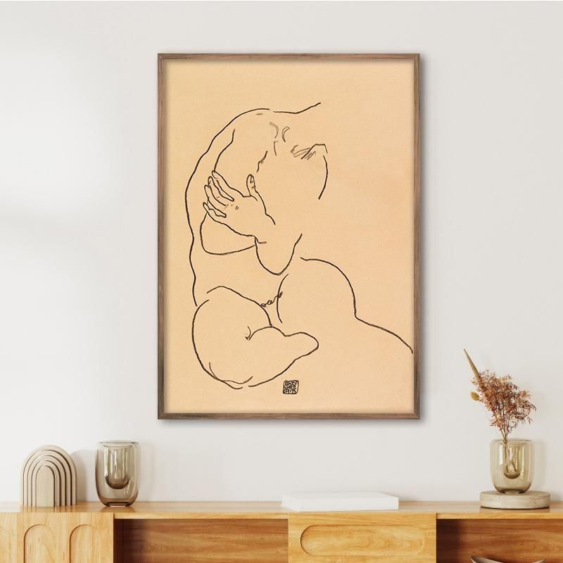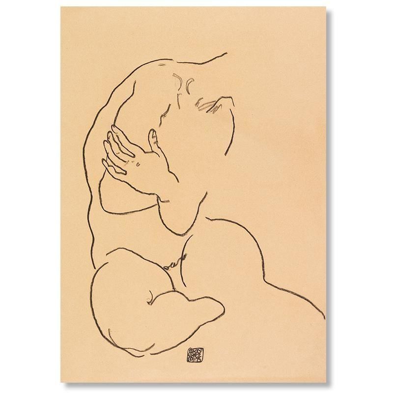 シーレの鋭くも簡潔な描線は、この作品の感情的な世界を力強く創り上げています。わずかな輪郭線にもかかわらず、身体の重みと皮膚の下に流れる生命の脈動が生々しく感じられます。