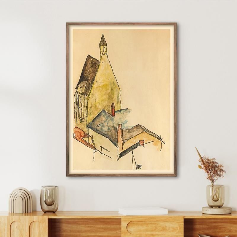 シーレ特有の神経質で震えるような描線は、建物の厳格なフォルムを意図的に歪め、建物の内側に潜む人間の魂の孤独と緊張感を視覚化しています。茶や黄土色を基調とした抑制された色調は、静かな悲しみと歴史の重みを感じさせます。