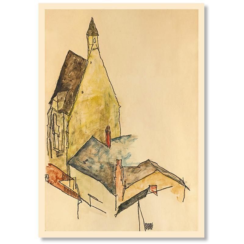 シーレの最晩年に感じていた終焉のドラマと世界の崩壊の予兆を映し出しています。鉛筆と水彩で描かれた教会の塔は、不安定にそびえ立ち、厳格な垂直性が揺らいでいるかのようです。不安定な構造と重厚な色彩の対比が、第一次世界大戦末期の時代の不安と画家の内省を強烈に暗示しています。