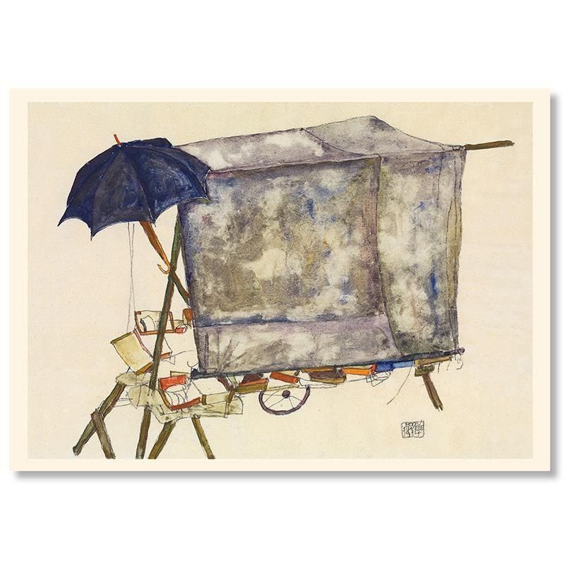 EgonSchiele StreetCart 1914 水彩画 ドイツ表現主義 オーストリア芸術 風景画 人物画 スケッチ ウィーン世紀末 孤独 内面 感情 表現主義の傑作 屋台 傘 車輪 希望 予感 芸術史 線の表現 構成の美 世紀末ウィーン デッサン