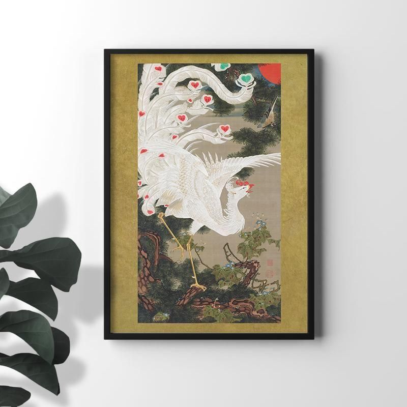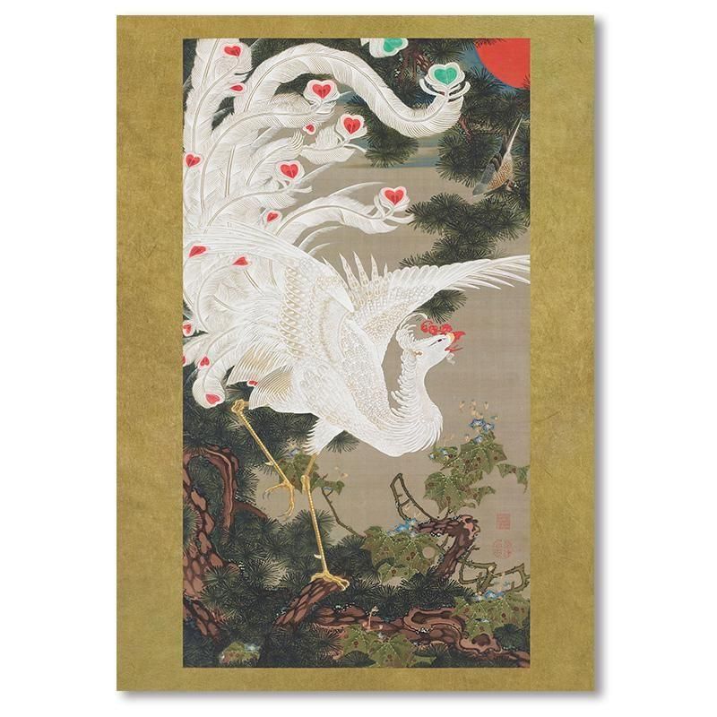 伊藤若冲の動植綵絵老松白鳳図は、江戸時代中期の日本画の中で、濃彩と極彩色が際立つ花鳥画の傑作です。白鳳と松の組み合わせが 生命力と再生をドラマティックに表現しており、絹本着色の掛軸には精密描写の筆致が凝縮されています。濃淡のコントラストは、奇想の画家と呼ばれた彼の革新性を示し、琳派の影響を受けつつも独自性を確立した京都の作家であり、吉祥 の象徴として未来への希望を感じさせる伝統的な作品です。