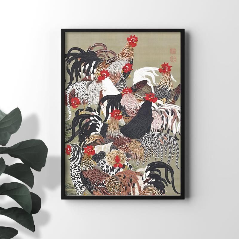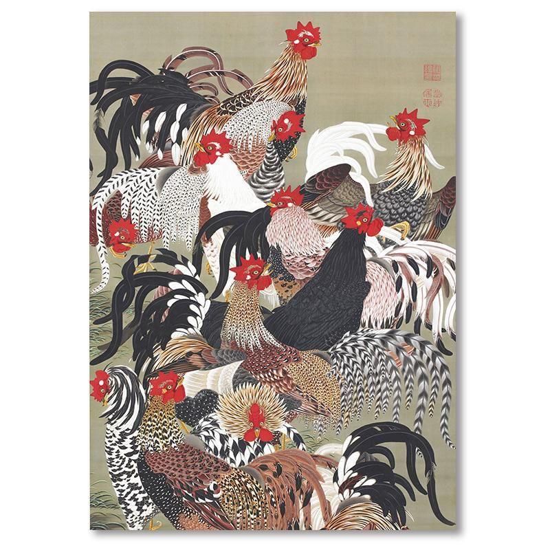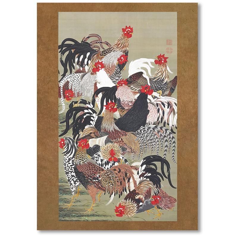 伊藤若冲の動植綵絵群鶏図 は、江戸時代中期の日本画の中で、濃彩と極彩色が際立つ花鳥画の傑作です。鶏の生命力 と 躍動感を ドラマティックに表現しており、絹本着色の掛軸には精密描写の筆致が凝縮されています。濃淡のコントラストと多様性に富んだ描写は、奇想の画家と呼ばれた彼の革新性を示し、琳派の影響を受けつつも独自性を確立した京都の作家であり、繁栄と未来への希望 を感じさせます。