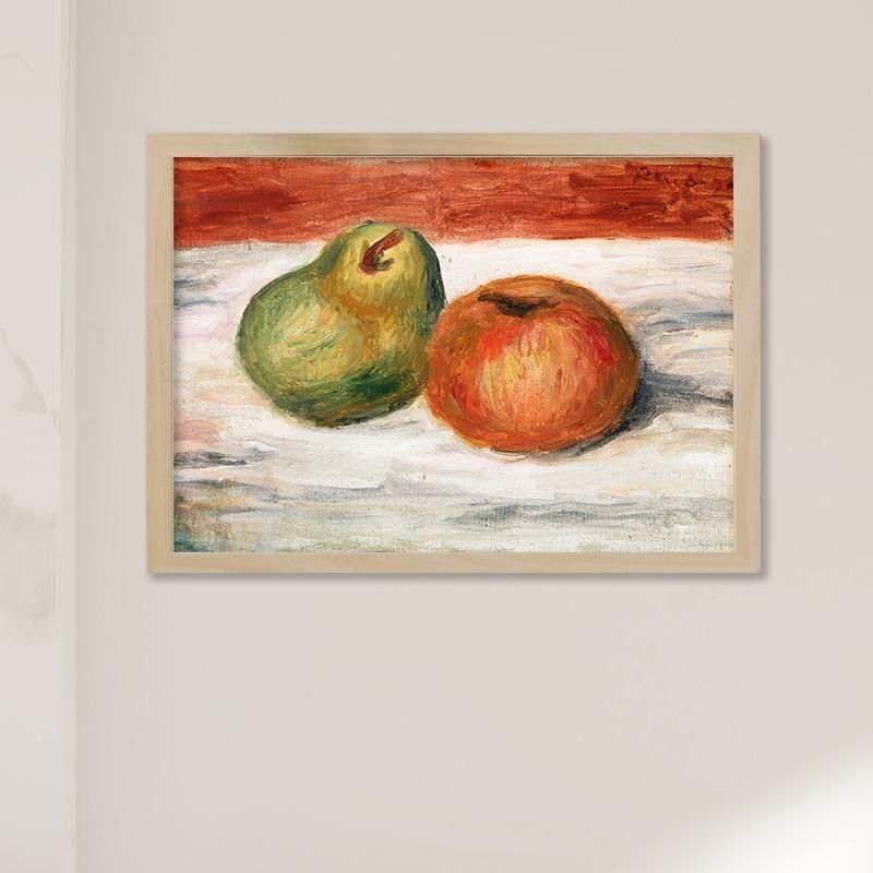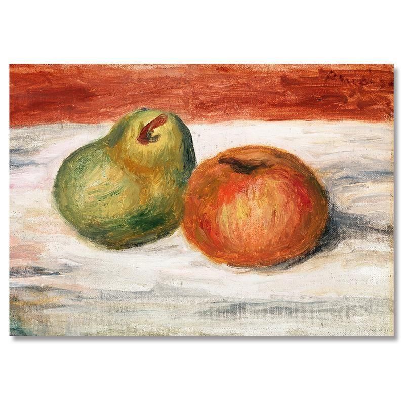 ピエールオーギュストルノワールの AppleandPearは1909 年頃の静物画であり、油彩画の技法によって印象派から ポスト印象派へと続く彼の芸術的探求を示しています。描かれた果物である洋梨と林檎は、シズル感のある質感と官能的な色彩により収穫の豊穣と日常生活の幸福をドラマティックに表現しています。フランス美術の巨匠である彼の筆致 が、未来への希望 を感じさせるこの油絵に強い生命力を与えています。
