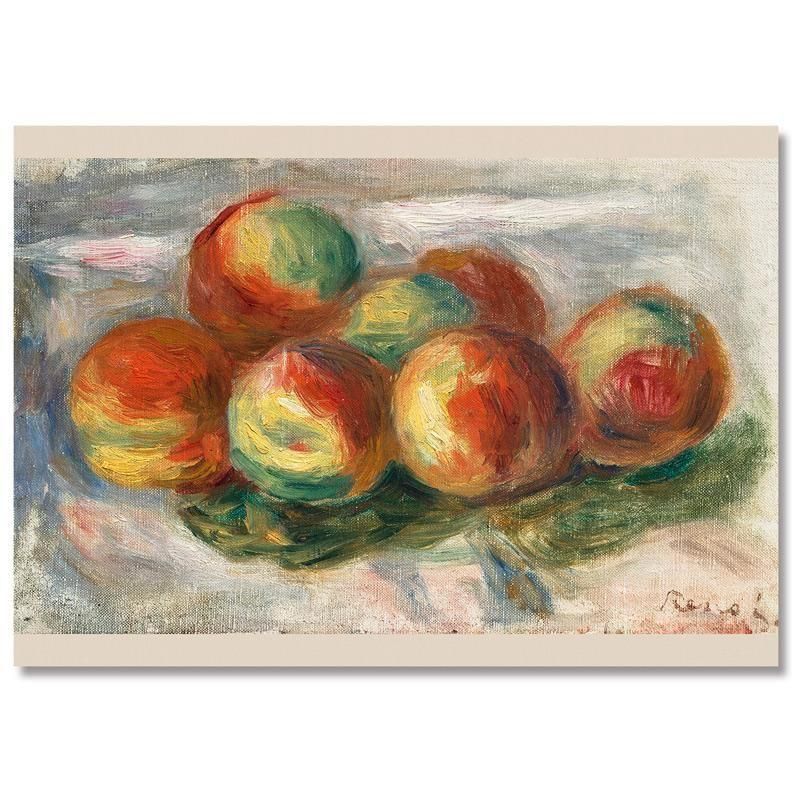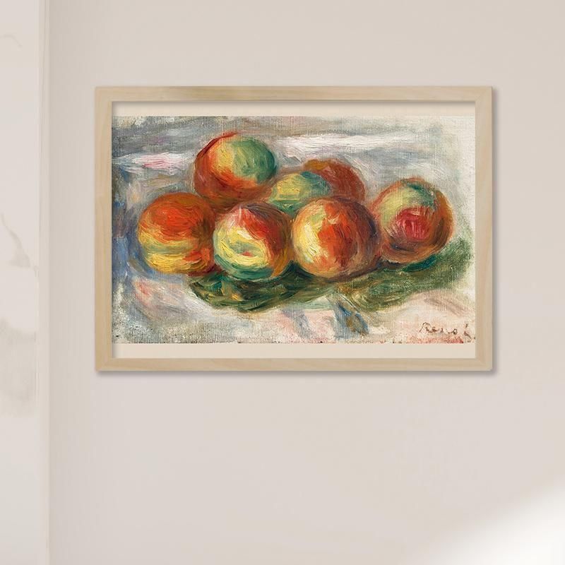 ピエールオーギュスト ルノワールのLesPêches は 1911年頃の静物画 であり、油彩画の技法によって 印象派からポスト印象派 へと続く彼の芸術的探求を示しています。描かれた果物である桃ピーチ は、シズル感のある質感と官能的な色彩により収穫の豊穣と日常生活の幸福をドラマティックに表現しています。フランス美術の巨匠である彼の筆致が、未来への希望を感じさせるこの油絵に強い生命力を与えています。