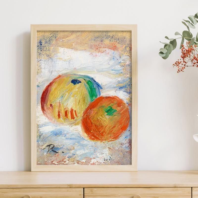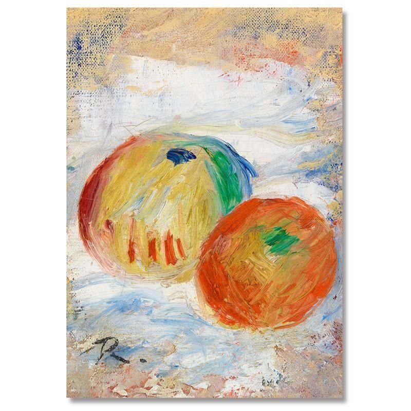 ピエールオーギュスト ルノワールのApplesは静物画 であり、油彩画の技法によって印象派から ポスト印象派 と至る晩年の彼の芸術的探求を示しています。描かれた果物である林檎 は、シズル感のある質感と官能的な色彩により収穫の豊穣と日常生活の幸福をドラマティックに表現しています。フランス美術の巨匠の筆致 が、未来への希望を感じさせるこの油絵に強い生命力を与えています。