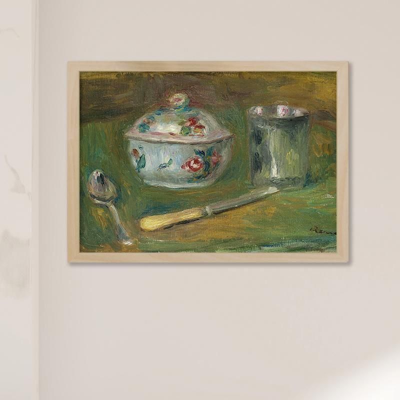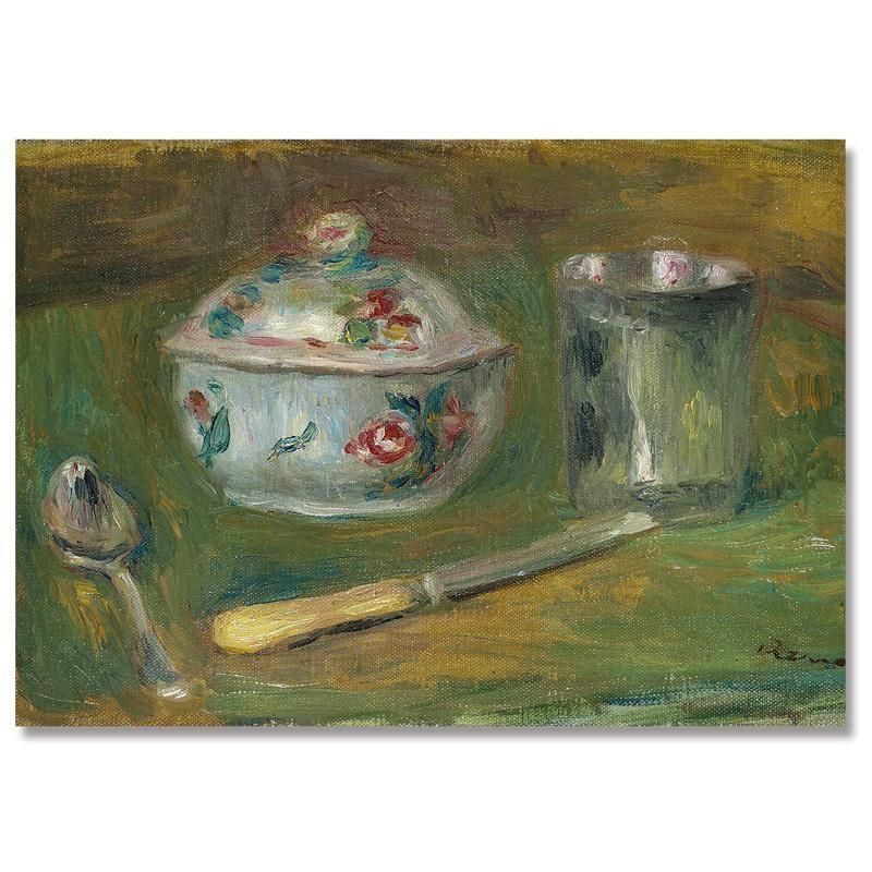 ピエールオーギュストルノワールのSucriergobeletcuillèreetcouteauは1910年頃の静物画であり、油彩画の技法によって印象派か ポスト印象派へと続く晩年の彼の芸術的探求を示しています。描かれたシュガーポット、タンブラー、カトラリーの質感、と光の表現の濃淡が、筆致により日常生活の幸福 を簡潔かつドラマティックに表現しています。フランス美術の巨匠の油絵は、未来への希望を感じさせる傑作です。