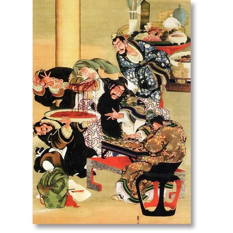 三国志の豪傑、関羽が毒矢の傷を治療する「割臂」の場面。医者(華佗とされる)が関羽の腕を切り開き、毒を取り除く手術が行われています。左腕で激痛に耐えながらも、右手で悠然と碁石を打ち続ける関羽。この極度の静寂を保った行為は、肉体の痛みを超越した、関羽の強靭な精神力と不屈の意志を象徴しています。血を流しながらも微動だにしないその落ち着き払った姿は、武将としての非凡な胆力と、死をも恐れない英雄の覚悟をドラマティックに際立たせています。この静と動、光と影の劇的な対比こそが、応為の真骨頂であり、父・北斎にも通じる大胆さと、登場人物の内面的な力強さを伝える筆致が見事に融合しています。