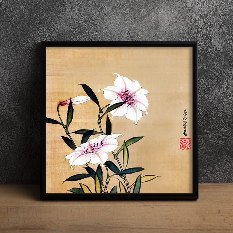 葛飾応為の百合図は、絹本着色で描かれた希少価値のある肉筆画であり、北斎娘である女性絵師の芸術的探求心と独自の画風が光る傑作です。花鳥画という伝統的題材に、暖色系で繊細な百合の花を描き、光と影を巧みに利用しない静謐な美しさの中に、応為の孤高の美と普遍的な世界観が表現されています。その生の筆致は、墨の濃淡や立体感に現れ、デッサン力の高さを示す日本画のアート作品として評価されています。