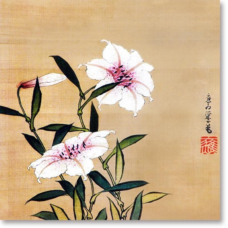 葛飾応為 百合図 花鳥画 肉筆画 絹本着色 江戸時代 北斎娘 女性絵師 百合の花 花の絵 傑作 希少価値 孤高の美 静謐 暖色系 日本画 芸術的探求心 伝統的題材 独自の画風 筆致 繊細 普遍的 光と影 デッサン力 墨の濃淡 立体感 アート