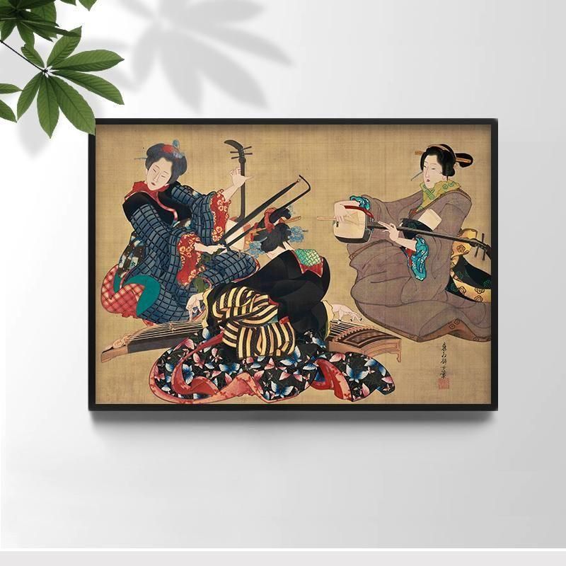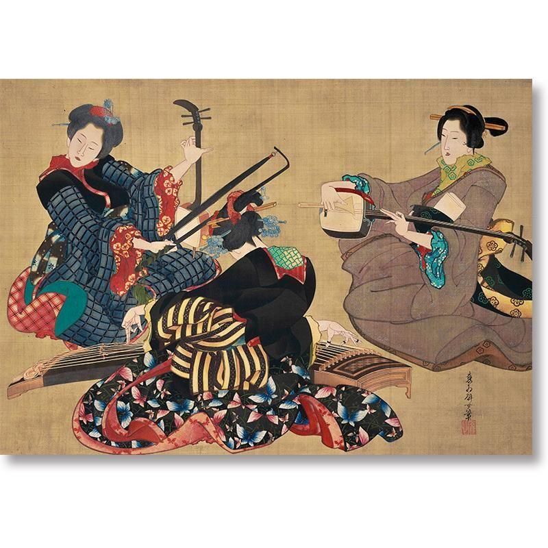 中央に琴を奏でる遊女、右に三味線を弾く芸者、左に胡弓を弾く町娘という、本来であれば共に演奏することがないはずの三人の女性が描かれています。この身分を超えた組み合わせこそが、応為が仕掛けた最大のドラマです。それぞれの楽器が持つ音色と、異なる立場の女性たちが交わす視線や、内面に秘めた感情が、画面上で複雑な人間模様と調和を生み出しています。