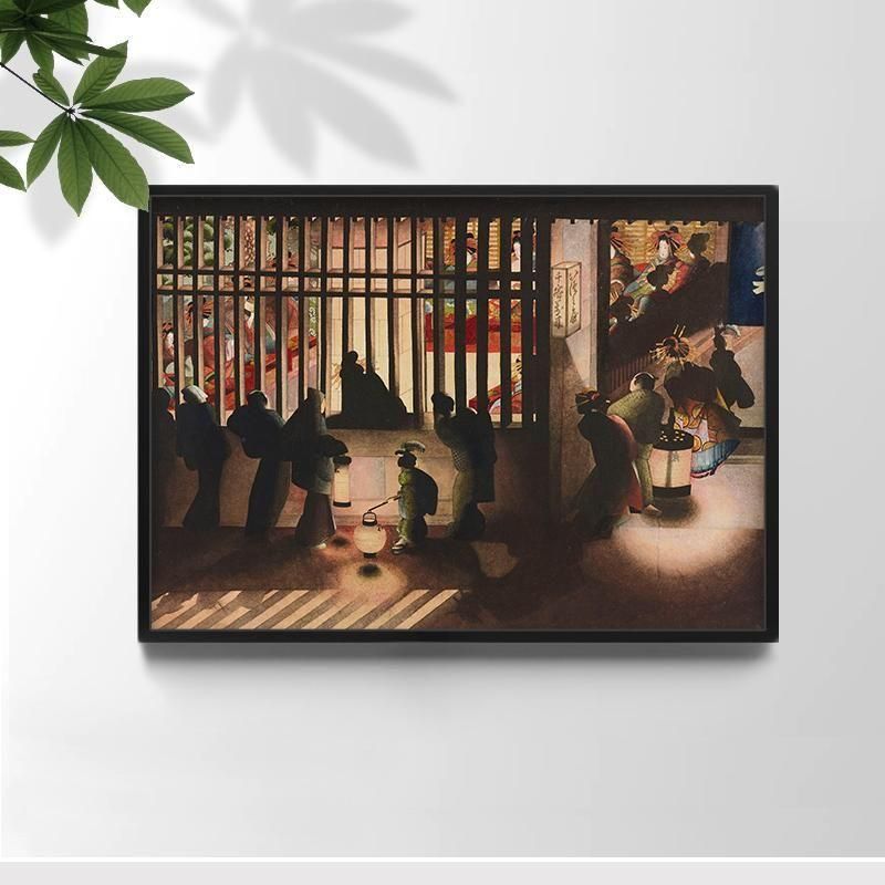 ほとんど闇に包まれた光景は、格子窓の奥から溢れ出す光と、客たちが持つ提灯の明かりが、強烈な視覚的効果を生んでいます。この光は、金屏風や遊女たちの華やかな衣装を照らし出し、格子の中に幻想的で手が届かない異世界を現出させています。西洋のキアロスクーロ(明暗法)を思わせる大胆な光の描写は、応為の革新的な芸術性と、吉原という夢の空間の魅力をドラマティックに表現しています。